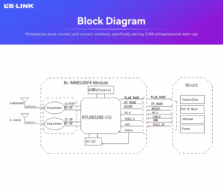 BL-M8852BP4 — это высокоинтегрированная комбинированная карта M.2 с двумя диапазоками WLAN+Bluetooth. Он сочетает в себе двухдиапазонный контроллер WLAN 2T2R с контроллерами интерфейса PCI Express и подсистему Bluetooth 5.2 с контроллером интерфейса USB. Эта карта совместима со стандартом IEEE 802.11 a/b/g/n/AC/ax и обеспечивает максимальную скорость PHY до 1201 Мбит/с, поддерживает двойной режим Bluetooth с поддержкой версий 5.2/v4.2/v2.1. Эта карта представляет собой комплексное решение для высокопроизводительных интегрированных беспроводных устройств и устройств Bluetooth, таких как ноутбуки, телеприставки, телевизоры Smart TV и т.д.